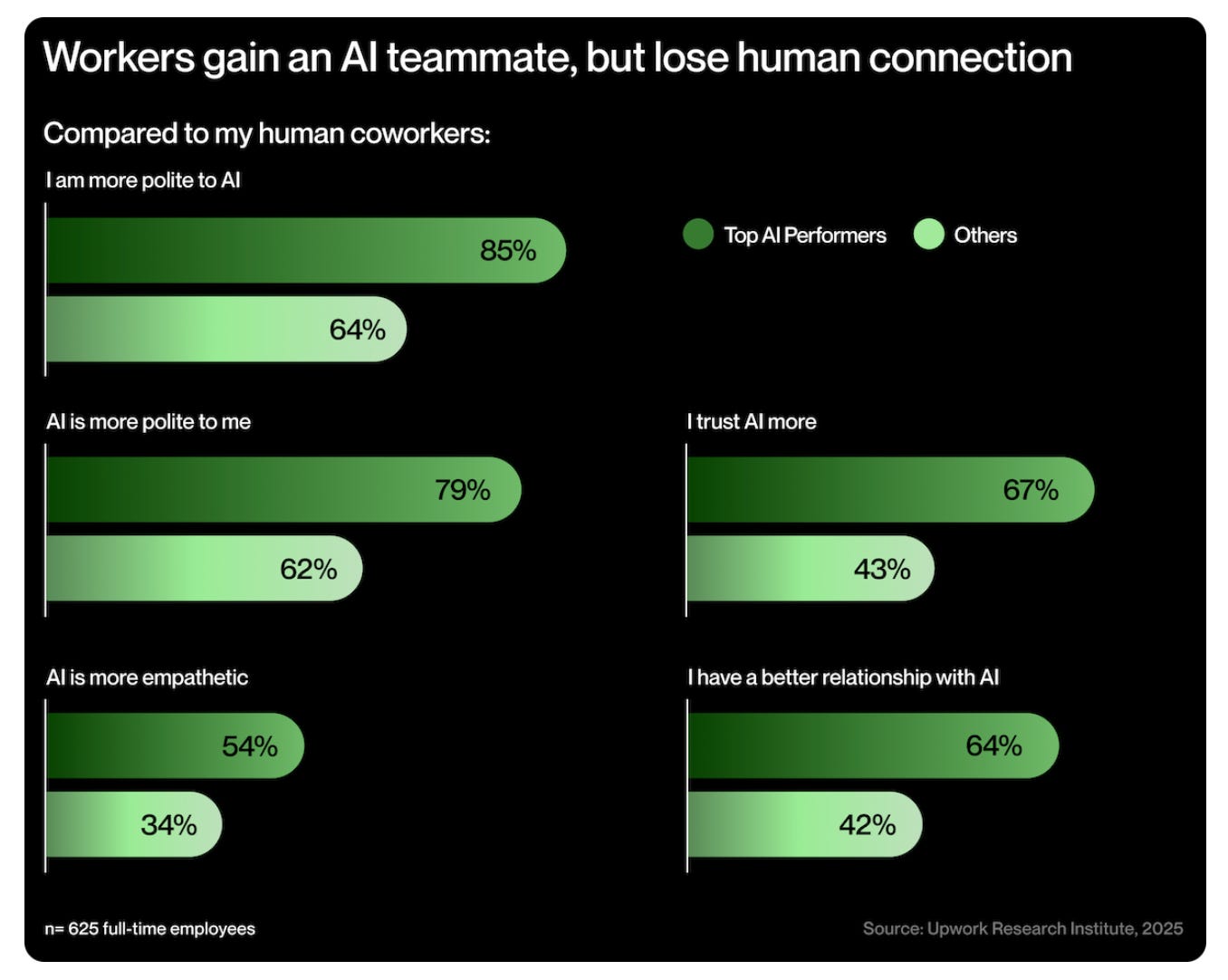 An Upwork survey found that workers who are the most productive with AI are turning away from connections with colleagues. While this is a clear signal of how AI could start to displace our weak ties, it also has implications for companies’ bottom line. Employers should be *worried* about stats like this because creating a siloed but productive organization can easily harm performance, decimate a culture of innovation, and even hinder well-known quality control measures.