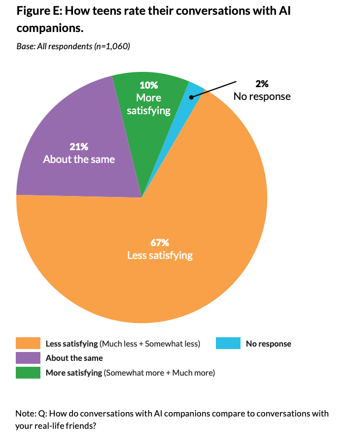 And/but: their data suggested that teens still value human connection over AI. A significant majority said they find AI conversations less satisfying than human conversations.