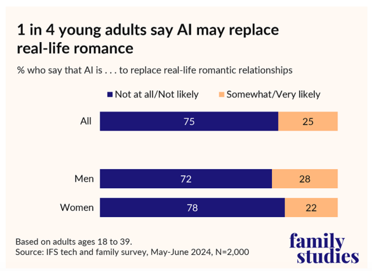 The Institute for Family Studies found that a quarter of the young adult population is here for AI romance. Of note, frequent porn consumers were significantly more likely to say AI could replace real-life romance… so AI companions are likely drafting off of a host of digitally mediated intimacy norms that have been shifting since long before Generative AI companions broke through in the market.