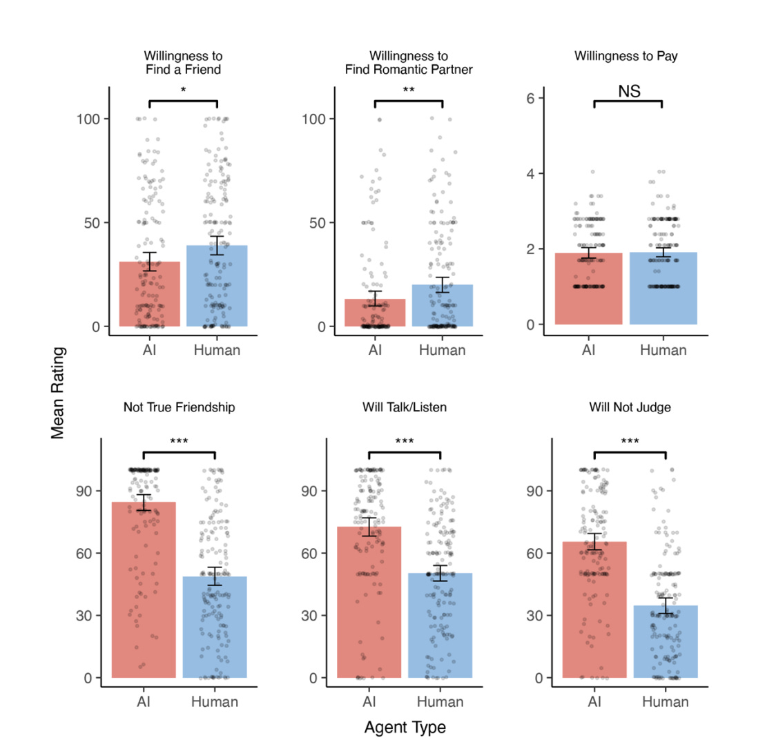 As an advocate for preserving and growing human connection, this stat gives me a lot of hope. Consistent with Freitas et al’s findings, people–including younger users–are still discerning something qualitatively different between human and synthetic interactions, and still may be yearning for the real thing.